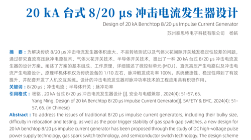 泰思特電子楊銘在《安全與電磁兼容》雜志2024年第04期發表一篇《20kA臺式8/20μs沖擊電流發生器設計》 論文,與您一起分享。
