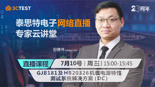 直播時間:7月10號(周三)15:00-15:45 課程摘要:針對GJB181及HB20326.7/8標準中直流供電測試要求,介紹系統方案包括測試設備、測試方法及測試軟件。歡迎大家參與直播互動~