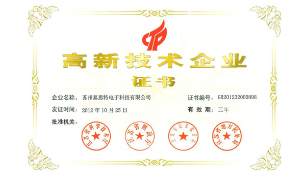 經過江蘇省高新技術企業認定部門及專家的嚴格審查,蘇州泰思特電子科技有限公司被認定為江蘇省高新技術企業。
