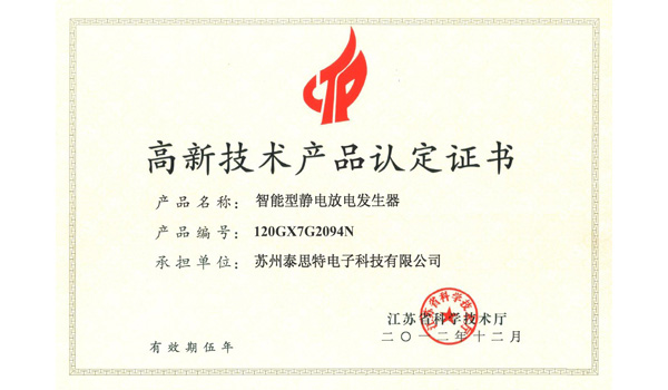 蘇州泰思特自主研發的智能型靜電放電發生器(手持式靜電放電模擬器)獲“江蘇省高新技術產品”認定證書。