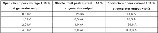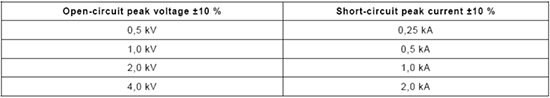 a 通常建議以最大的額定沖擊電壓校準CDN,這樣能將CLD和GDT產生的開關噪聲的影響最小化。表中的值對應發生器設定值為4kV。如果CDN的額定沖擊電壓值是其他的最大值,那么應以該最大值校準。規定的短路峰值電流要求也應相應的變化。例如,如果最大電壓為1kV,那么短路電流值應在此表的基礎上乘以1/4。 b 通過氣體避雷器、鉗位器或雪崩器件的耦合將會對浪涌波形產生一些開關噪聲。以最大可能的浪涌電壓進行校準能使得測量誤差最小化。通常建議忽略開關噪音對波前時間和持續時間測量的影響。 c 表中的值是CWG的理想值。如果CWG產生的波形參數值接近允差,那么CDN帶來的額外允差可能使得CWG和CDN的組合超出允差。 |