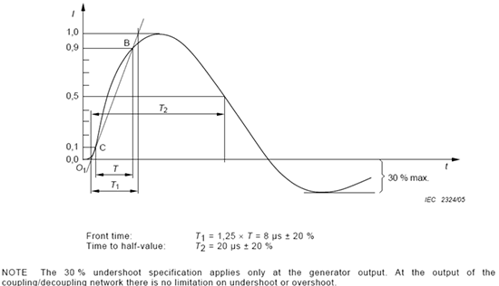 由于大電流小阻抗的EUT可能與浪涌發生器連接,則大部分的浪涌能量將被發生器的輸出阻抗吸收。