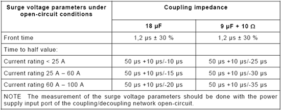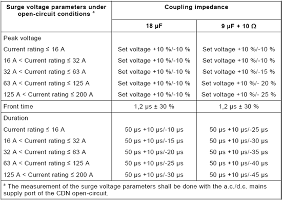 a建議以最大的額定浪涌電壓對CDN進行校準,這將減少由CLD和GDT產生的開關噪聲的影響。表中所示數值對應發生器的設定電壓為2kV。如果CDN的額定浪涌電壓值是另外一個最大值,那么應按這個最大值校準。短路峰值電流要求也應相應的變化。例如,如果最大電壓為4kV,那么短路電流值應在此表的基礎上乘以2。 b氣體避雷器、鉗位器和雪崩器件耦合設備能對浪涌波形產生開關噪音。用最大可能浪涌電壓校準能將這些測量誤差最小化。通常建議忽略峰值測量時的開關噪音。 c表中的值是CWG的理想值。如果CWG產生的波形參數值接近允差,那么CDN帶來的額外允差可能使得CWG和CDN的組合超出允差。 d耦合裝置(CD)可能是基于電容、氣體避雷器、鉗位器、雪崩器件或任何其他可以使得EUT所需的數據正常工作的方式,同時,滿足該表規定的浪涌波形參數。 |
