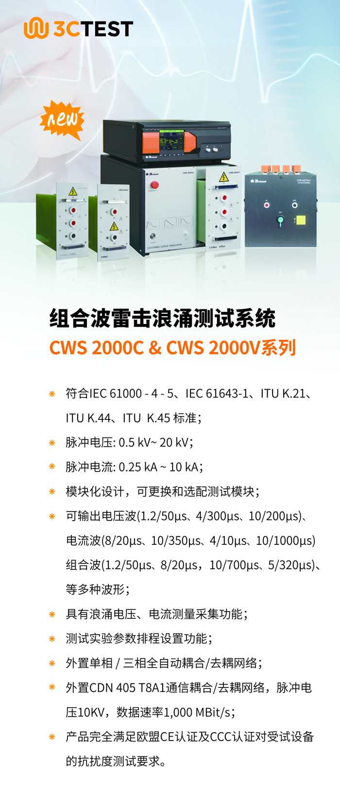 CWS 2000V能夠產生1.2/50 μs、8/20 μs高壓脈沖波形等多脈沖波形輸出。滿足IEC 61000-4-5等標準要求。CWS 2000C &CWS 2000V性能完全滿足歐盟CE認證及CCC認證對受試設備的抗擾度測試要求。