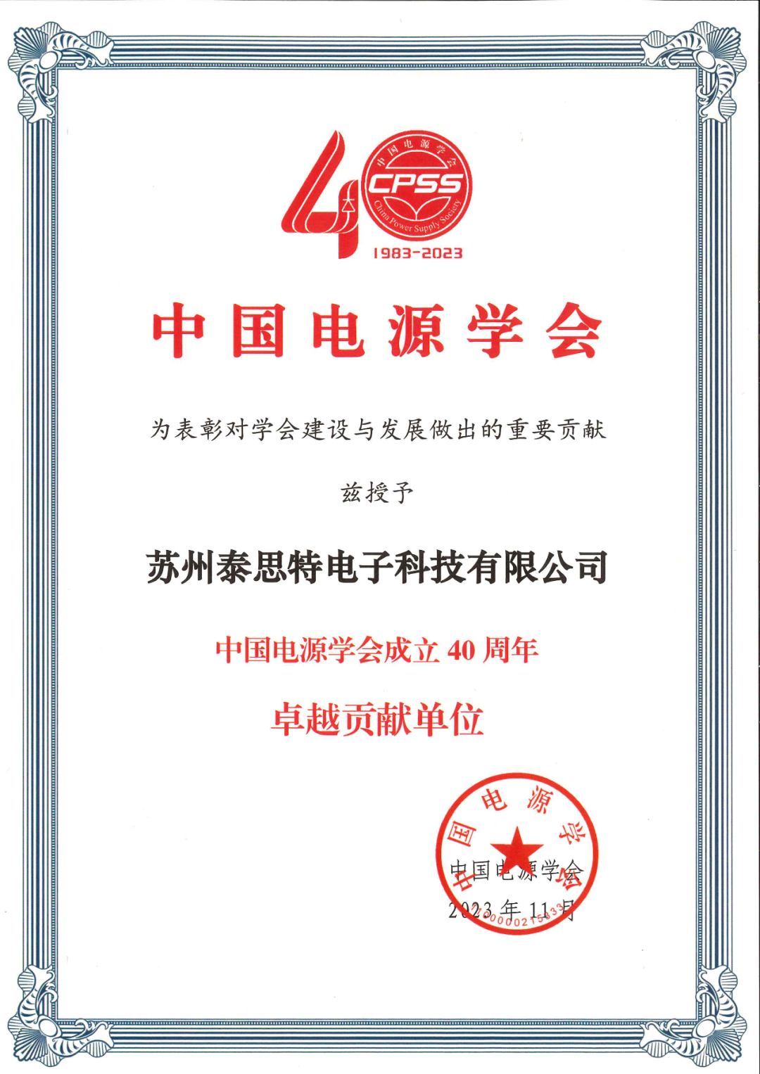蘇州泰思特電子科技有限公司多年來一直積極參與學會活動,緊跟電源科技發展腳步,不斷提升企業產品競爭力和技術研發實力,致力于推動電源行業發展。為此學會授予蘇州泰思特電子“中國電源學會成立40周年卓越貢獻單位獎” ,充分體現了學會對蘇州泰思特電子作為企業對學會各項工作所做出的努力與貢獻的認可。蘇州泰思特電子也將繼續與學會緊密合作,共推、共享電源科技領域的未來發展和產業繁榮。
