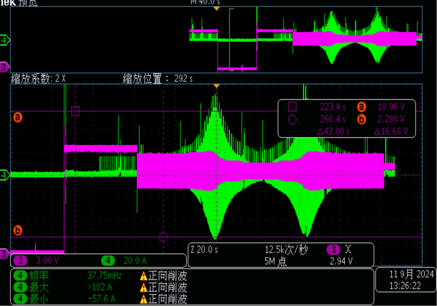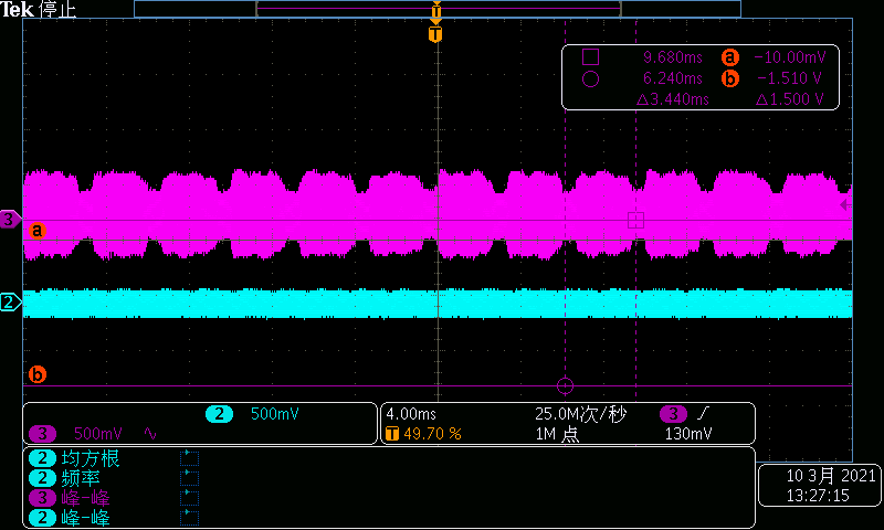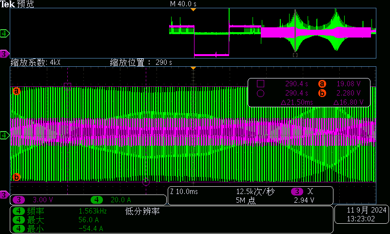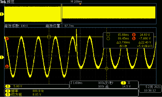 上圖是一款試品做疊加交流測試的波形圖,參數設置為:供電電壓為11V,疊加交流幅度:4V Vpp,頻率:10Hz~30kHz。圖中粉色波形是電壓波,綠色是電流波(電流波中的尖峰是由于試品中的電機突然啟動導致)。