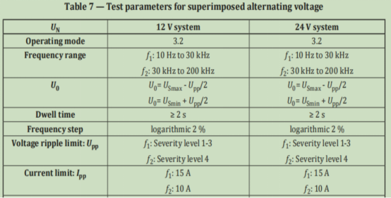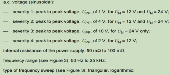 ISO 16750-2-2023標準疊加交流測試項目,規定了電壓幅度、起始頻率,沒有要求發生器內阻,但規定了電流限值。這樣可以有效地保證加到試品上的能量。