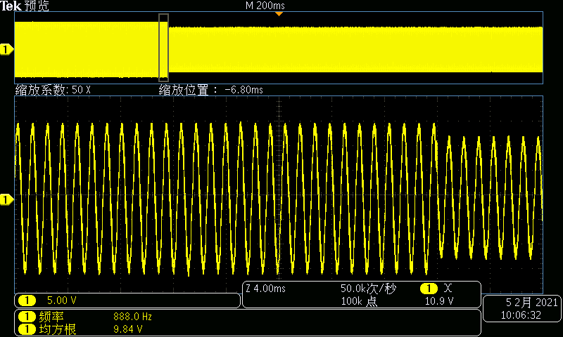 設置交流電壓10V,外接純電阻負載:輸出波形分壓比例符合理論值。