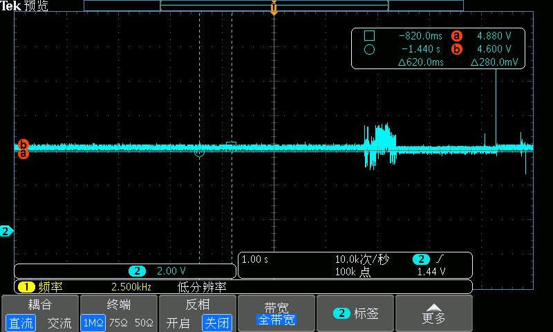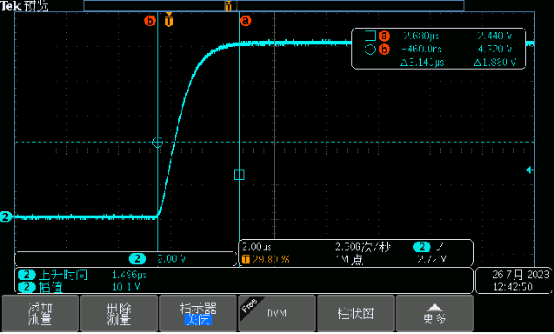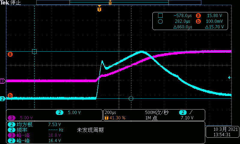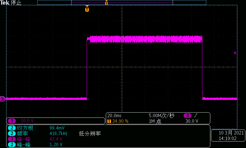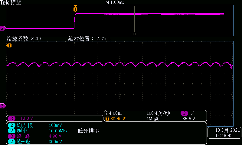 某款設備,設定電壓:0V過壓至40V,帶0.5Ω電阻作為負載。實測高壓處波形有振蕩,這種高頻振蕩可能會帶來測試的不確定性。