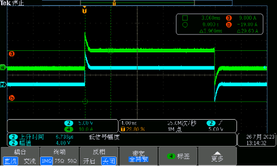 某款設備,設定電壓:0V升到10V,帶0.5Ω負載,測試設備突然帶載能力。實測電壓波形和電流波形過沖嚴重,超過幅度的50%。這種過沖可能會導致試品損壞。