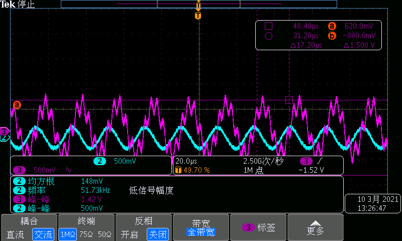 交流50kHz, Vpp 2V,帶10μF電容,電壓波(粉色)畸形。