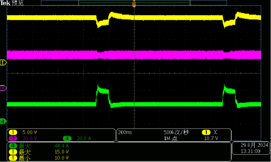 用一款電流30A的可編程電源給某個試品供電,電壓14V,負載常態電流18A左右。試品的電機突然啟動時瞬態電流44A,持續時間100ms左右,電源電壓波動2V,導致試品報錯。