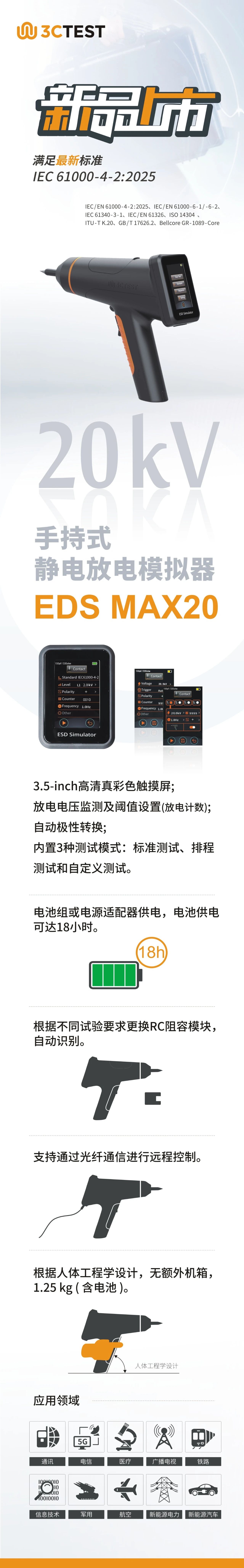 EDS MAX20基于我司第四代平臺研發設計,體積小,重量輕;3.5寸彩色觸摸屏,操作簡單,RC模塊可更換,內置溫度濕度計和槍頭電壓檢測功能,確保了在各種測試場合使用的可靠性。