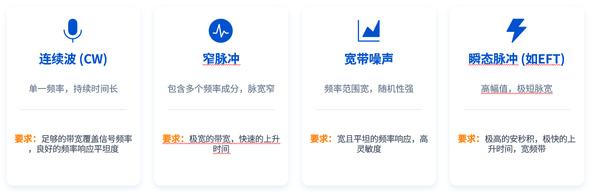 不同信號類型(頻率成分、幅值、持續時間)決定了探頭的關鍵參數匹配。例如,面對瞬態大電流脈沖,必須優先考量探頭的安秒積和響應速度。