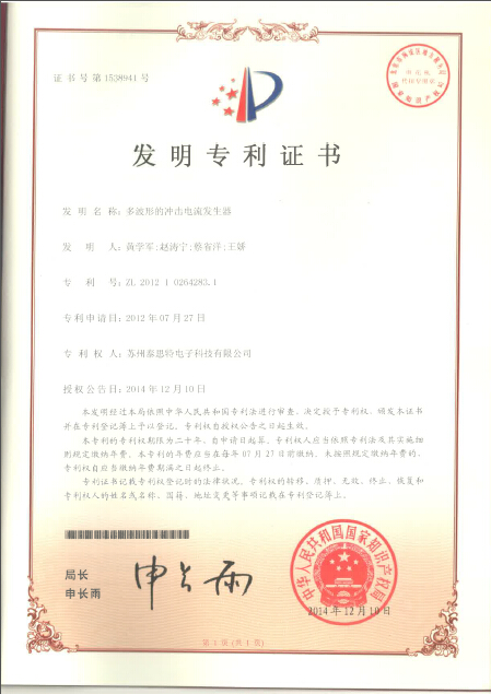 企業(yè)快訊 近日,我公司再次獲得一項(xiàng)國家發(fā)明專利證書“多波形的沖擊電流發(fā)生器”,本次專利是公司獲得的第20項(xiàng)專利。蘇州泰思特是一家尊重知識(shí)產(chǎn)權(quán)的公司,長期以來重視科技創(chuàng)新,我們會(huì)更加努力的開拓進(jìn)取,爭(zhēng)取獲得更多的研究成果并將之轉(zhuǎn)化為生產(chǎn)力。