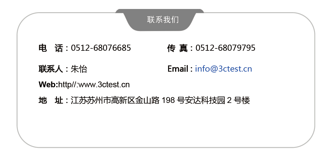 聯系人:朱怡 聯系電話:0512-68076685 Email:info@3ctest.cn