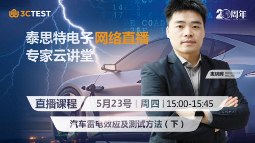 直播時間:5月23號(周四)15:00-15:45; 課程摘要:通用汽車的雷電直接效應影響及試驗方法、波形要求。(大電流小電流測試)