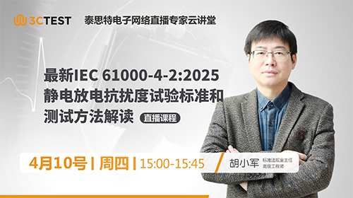 直播時間:2025年4月10日(周四)下午15:00-15:45 課程摘要:最新IEC 61000-4-2:2025靜電放電抗擾度試驗標準和測試方法解讀