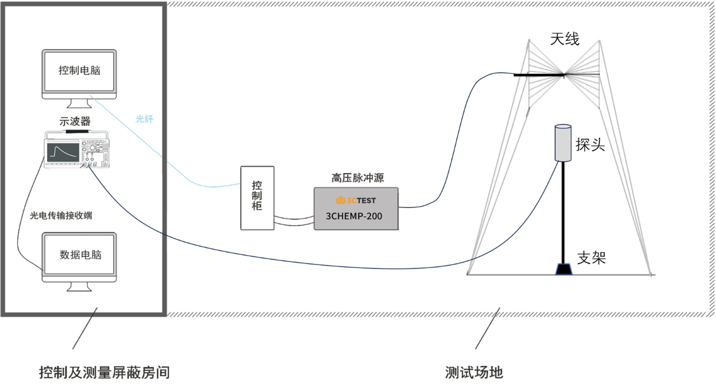 脈沖電場(chǎng)測(cè)量系統(tǒng)采用基于光纖傳輸?shù)挠性措妶?chǎng)測(cè)量系統(tǒng), 主要由接收天線、前置電路、電光轉(zhuǎn)換電路、傳輸光纖和光電轉(zhuǎn)換電路等組成。測(cè)量系統(tǒng)上升時(shí)間小于1 ns, 可用半高寬不小于100 ns, 量程覆蓋1 kV / m - 100 kV / m范圍。 |