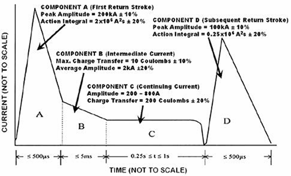 電流峰值100 kA ± 10%,單向或震蕩電流,上升(峰值前10% - 90%)時間不大于25μs,電流衰減到波峰的1%時間不超過500 μs,作用積分為0.25×106A2S ± 20%(在500 μs內)。 |