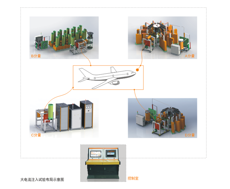 飛機在強對流天氣飛行時,容易受到雷電的直接附著作用,產生高溫、高壓和強電磁力,對飛機造成燃燒、溶蝕、爆炸、結構畸變和強度降低等效應。我司自主研發(fā)的飛機整機防雷測試系統(tǒng)是一套非常復雜的脈沖電流測試系統(tǒng),完全符合美軍標MIL-STD-464C、SAE ARP5412、DO160 section23等飛機防雷標準要求,模擬飛機的直接附著雷擊區(qū)域應承受由ABCD四個波形組成的連續(xù)波形進行直接效應雷擊,整套系統(tǒng)包含4套脈沖電流發(fā)生器。 |